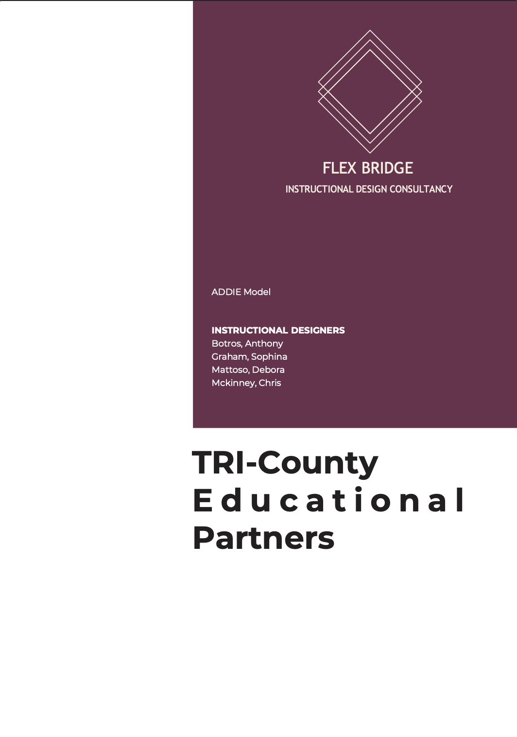 The instructional design model ADDIE was used, and each team member was assigned as the senior instructional designer in charge of a specific stage. In the instructional solution for TRI-County Educational Partners, my role as an instructional designer was overseeing aspects of the evaluation stage. I oversaw the project as a whole and ensured each team member’s contribution blend as one cohesive plan. I also facilitated group polls to gain insight on color schemes, design elements, company name, and company logo.